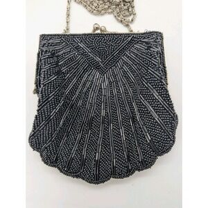 Step into timeless elegance with this exquisite Whittall & Shon evening bag. Proudly made in the USA, this vintage piece features a sophisticated scalloped shell design entirely handcrafted with shimmering black glass beads and bugle beads. The fan-like pattern creates a stunning 3D texture that catches the light beautifully, making it the perfect accessory for a black-tie event, wedding, or gala.