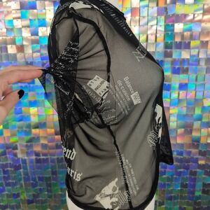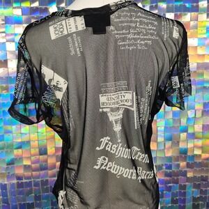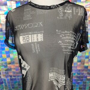Just Polly New York mesh top in size XL featuring a bold graphic print with text and imagery inspired by New York and fashion trends. This short sleeve top has a crew neckline and a slightly sheer finish, ideal for layering or making a statement on its own. The all-over print includes elements like "New York", "Uomo Moda", "Fashion Trends", and Parisian motifs.