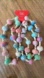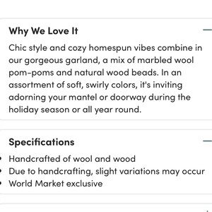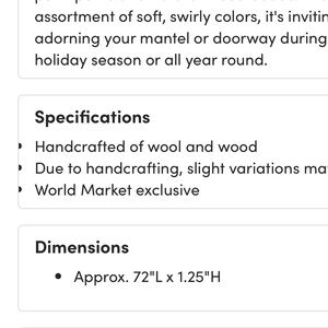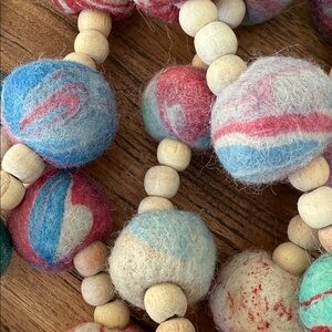 Colorful artisan style handcrafted garland from World Market featuring hand felted wool balls paired w/ natural wood beads. Design has a soft marble look w/ beautifully muted tones including green blue pink orange cream magenta light yellow purple creating an earthy yet cheerful palette.