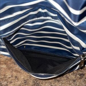 Stylish and durable, this navy and white striped backpack is perfect for everyday use. Its sleek design offers ample storage and comfort.