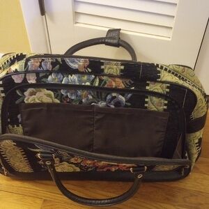 Elegant floral tapestry travel bag with black faux leather accents. Beaded with crystals. Generous pockets on either side, and large center compartment. Telescope handle in zip cover. Perfect for stylish getaways. NWT.