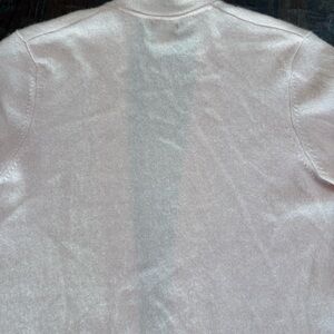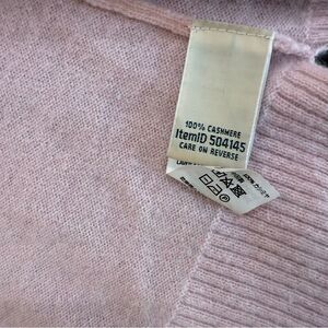 Light pink cashmere cardigan with pockets by L.L. Bean. Pockets and cuffs are ribbed and the opening has a flat trim that goes around the neck. There is slight beading visible on the garment.