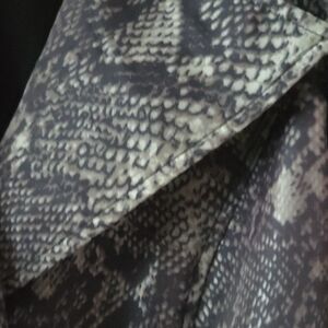 Stylish snake print trench coat. Features a classic lapel collar and tie belt. Perfect for a bold look.