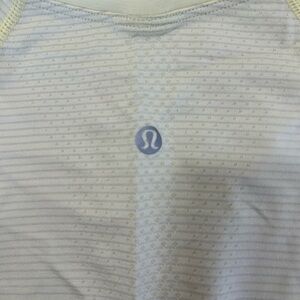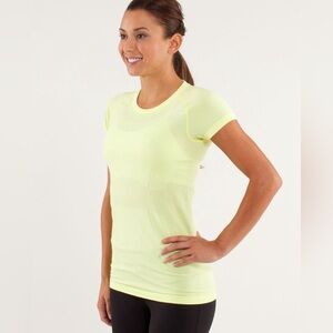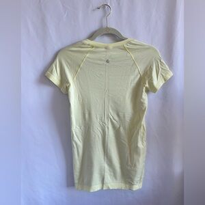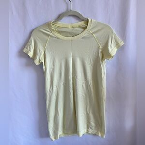 The item is a Lululemon Swiftly Tech Short Sleeve Shirt. This light yellow/lime green athletic top is designed for running and training, featuring a slim fit, hip length, and a seamless construction that minimizes chafing. The fabric is lightweight, sweat-wicking, and breathable, incorporating Silverescent™ technology powered by X-STATIC® to inhibit the growth of odor-causing bacteria. The shirt has a subtle striped texture and the Lululemon logo is visible on the upper back. Lululemon, Swiftly Tech, Short Sleeve, Shirt, Top, Athletic, Running, Training, Workout, Gym, Fitness, Activewear, Performance, Seamless, Sweat-wicking, Breathable, Anti-odor, Silverescent, X-STATIC, Tech, Performance, Lightweight, Slim fit, Hip length, Yellow, Lime green, Neon, Striped, Athletic apparel, Sportswear, Yoga, Pilates, Tennis, Casual, Athleisure, Trending, Popular, Classic, Staple, Essential, Quality, Durable, High performance