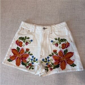 Vibrant floral embroidery on these shorts. High waist design. Perfect for casual outings.