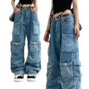 Stylish relaxed fit jeans. Features multiple cargo pockets. Perfect for everyday wear. Super high-waisted jeans with belt loops. Front pockets, buttoned flap patch pocket at leg, and back patch pocket. Front pleat detail. Front zip and button closure. High quality, heavyweight, hangs nicely with heels, boots and sneakers. Dress them up or down.