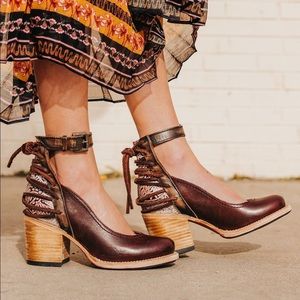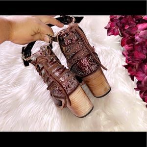 Stylish brown leather heels with tan accents. Features intricate cutout design. Perfect for any occasion.