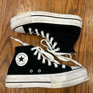 Classic platform style Converse high-tops in black. Features white accents and durable design. Ideal for everyday wear. Size 7.5