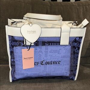 • Tote Details: Clear blue PVC with white trim, dual top handles, and a signature heart-shaped "Juicy Couture" hangtag.