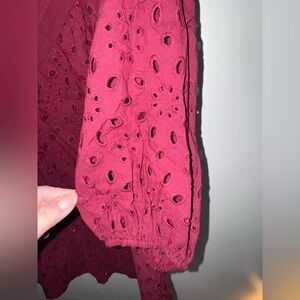 This elegant burgundy eyelet blouse is perfect for any occasion. Its intricate design adds a touch of sophistication to your wardrobe.