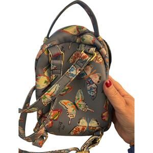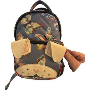 Adorable and unique Betsey Johnson mini backpack featuring a playful puppy face design with cream faux leather floppy ears and a heart shaped nose. The bag is crafted in a soft gray faux leather with a colorful butterfly print all over. Inside has signature floral lining and XOX Betsey. Quilted stitching details, stud accents, zip closure, adjustable backpack straps, top carry handle. 6"x 7"