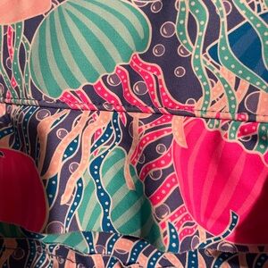 Chic sleeveless dress with vibrant patterns. Features pink and blue hues. Fun tiered layered dress. Very packable great for travel any occasion size large