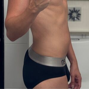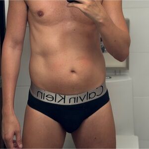 Sleek black briefs with a comfortable gray waistband. Signature Calvin Klein style.