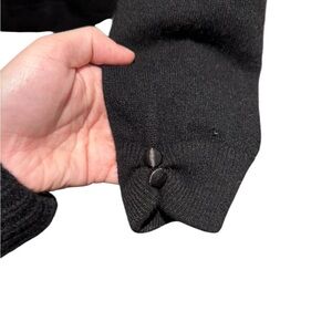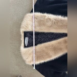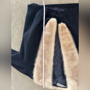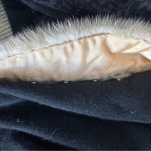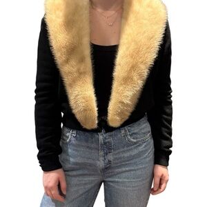 Elegant black sweater featuring a luxurious tan fur collar. Perfect for adding a touch of sophistication to any outfit.