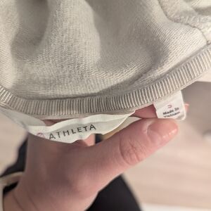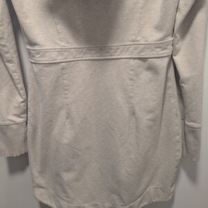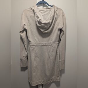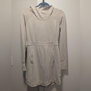 From back when Athleta was well-made... and when I wore dresses. Super comfy sweatshirt dress with hood, pockets, and thumb holes in a heathered sandy beige color. Great for travel, weekends, errands, you name it. No visible signs of wear, but I did wear this a fair amount as a size 6 or slim 8.