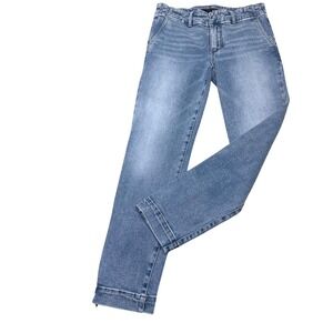 Like new condition Abercrombie & Fitch Curve Love The 90s Straight Ultra High Rise jeans in a light wash with split hem. These denim jeans offer a flattering high rise and a classic straight leg silhouette with a subtle distressed detail on the back pockets.