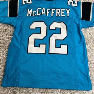 Blue jersey featuring 'McCaffrey' and number '22' in black and white. Perfect for sports fans.