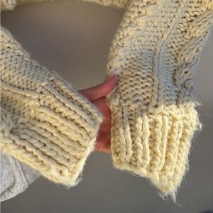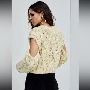 Elegant cable knit design. Features open shoulder detail. Perfect for chic layering.