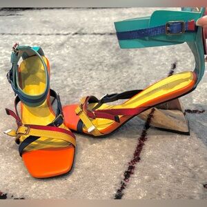 Vibrant colors, golden 2.5” heels uniquely shaped. They are super comfortable, all straps are adjustable. These are sure to turn heads!