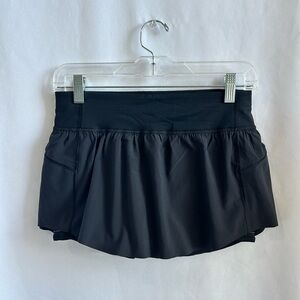 Lululemon Mid-Rise Skirt Long is a black athletic skirt designed for running, tennis, or golf. It is made with lightweight, sweat-wicking, and quick-drying fabric, and features a Luxtreme™ fabric liner that is cool, smooth, and offers four-way stretch and shape retention. This versatile skort has a mid-rise fit and is designed to be comfortable and functional for various activities. Lululemon, Pace Rival, Mid-Rise, Skirt, Skort, Long, Black, Athletic, Athleisure, Running, Tennis, Golf, Pickleball, Activewear, Performance,Gently used, Resale, Lightweight, Sweat-wicking
