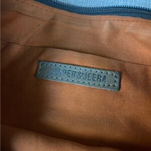 Stylish clutch with artistic blue and cream design. Features a convenient wrist strap. Purchased at Anthropologie in the 2010's. Only used a few times. Pen mark on the inside. See all photos.