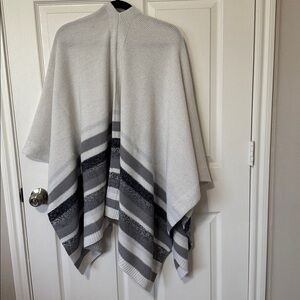White House black market white sweater poncho with grey, blue, and white stripes. One size but I am typically a 2X and it fit me. Great for formal or casual events. Comes from smoke free, pet free home.