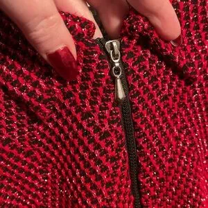 Stylish zip-up jacket by Alfred Dunner featuring a black and red design with “sparkle knit”, metallic silver thread woven throughout. Vintage women’s size 12. Smooth zipper, pockets, and in excellent condition.