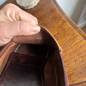 Stylish and durable brown leather loafers perfect for any occasion. Rugged soles with good grip and rubber. Some wear on the leather, more of a worn look. Soles are in great shape but on sole looks like it may need to be re-glued in a spot on the front (tried to show in the picture). No size noted but fits like a 38-38.5 (7-7.5) works well wide a wide foot