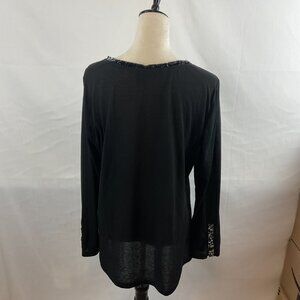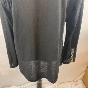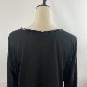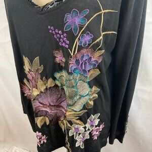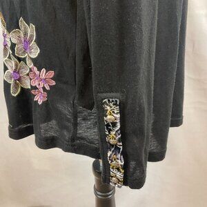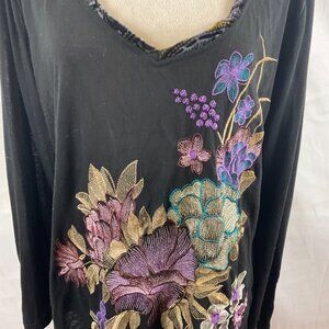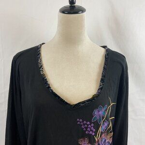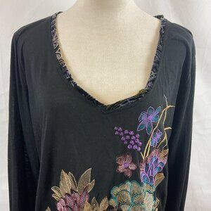 Aratta Silent Gourney Top XL Black Embroidered Purple Green Blue Floral Velvet Trim Long Sleeve Journey