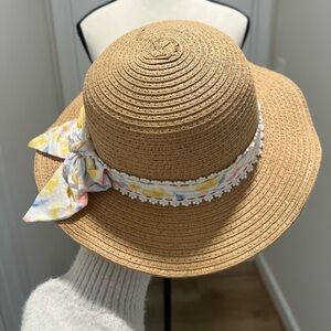 Chic straw hat featuring a floral bow with yellow and blue accents. Perfect for sunny days.