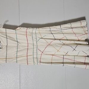 Elegant sleeveless dress in a soft cream shade with unique multicolored embroidered pattern. Perfect for any occasion. Note the embroidery detail. Pockets!! Fully lined.
