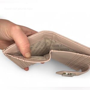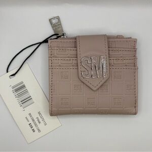 NWT Steve Madden BKAI wallet in blush pink shade. It is a compact bifold wallet with a snap closure, featuring an embossed exterior, multiple card slots, a clear ID window, and a zippered coin pocket.