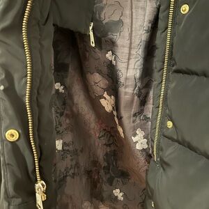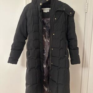 Elegant black puffer jacket with hood. Long design for extra warmth. Ideal for cold weather - 50% down and 50% feather fill. Small hole on the inside of the hood (see picture). Lots of compliments on this jacket!
