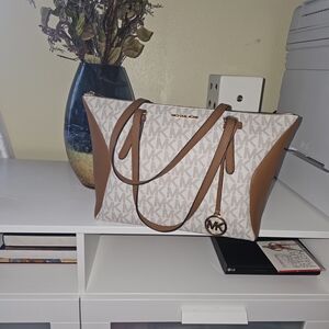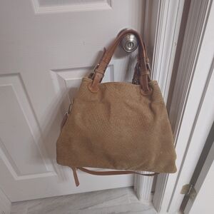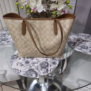 Signature coated canvas and smooth leather Inside zip pocket Snap closure Handles with 10 drop 13 (L) x 11 1/2 (H) x 6 1/4 (W) Style No. 5696-1