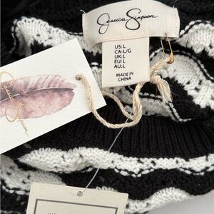 Stylish black and white chevron knit set. Includes a sleeveless top and matching skirt. Perfect for a chic look.