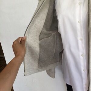 Step out in this elegant tan light gray lapel collar, tapered button sleeves pea coat jacket size m by Avec Les Filles. Features 2 large square top front pockets with 2 side slit front pockets, zipper front closure. Thick and warm. It’s in excellent condition. No rips, stains or smells. See pics for measurements. Perfect for layering over a cute outfit.