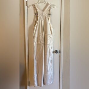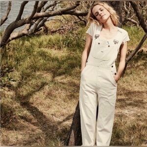Size 29 Doen Myrtle Overalls in Oatmilk. Excellent condition, she does have some drag dirt marks from floor at the bottom of leg shown in pics which should come out when washed.