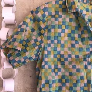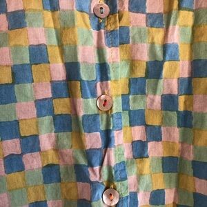 Cute cropped button-down, short sleeve shirt by Matta. Love this fabric so much but the style doesn’t work with my wardrobe so well. Also love the detail of different thread colors on the buttons!
