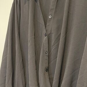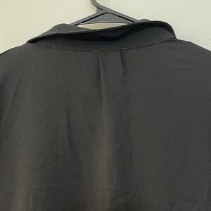 Sophisticated black blouse with a draped front. Button-up style, but connected at the waist. Balloon sleeves with a cuff.