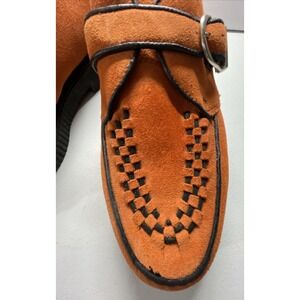 Step into bold style with these GBX Allegiance monk strap creeper shoes. The vibrant orange suede uppers are adorned with intricate woven detailing and accented with contrasting black trim, creating a unique visual appeal that commands attention. A polished silver buckle secures the monk strap, offering both adjustability and a touch of classic flair. The distinctive creeper sole provides a comfortable foundation and an unmistakable silhouette, perfect for making a statement. Elevate your look for concerts, themed parties, or a night out with friends.