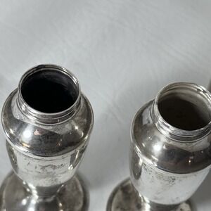 Antique Weidlich Sterling Spoon Co. salt and pepper shaker set, crafted in solid sterling silver and marked with the eagle "W" hallmark and STERLING, confirming genuine American sterling silver.