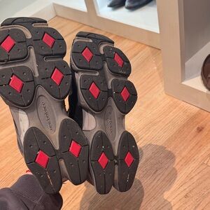 Sleek New Balance shoes in black and gray. Red logo detail adds a pop of color. Worn few times. Check condition in photos.