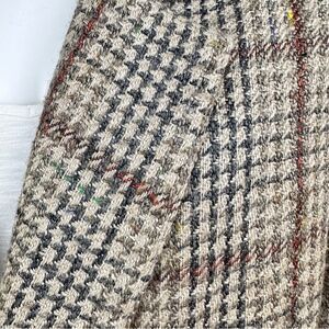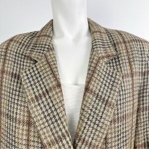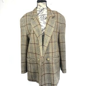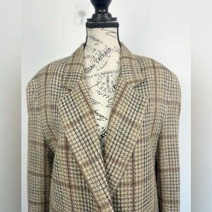 Vintage Pierre Balmain blazer in classic check houndstooth pattern . Earthy tones of beige , tan and brown .