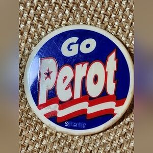 "Go Perot" campaign pin from Ross Perot's 1992 presidential campaign. Ross Perot ran as an independent/third-party candidate in that election. It is a Political campaign pinback/button that measures approximately 2 1/4 inches in diameter. .