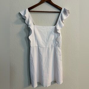 Chic white mini dress with stylish ruffle sleeves. Perfect for a modern look.