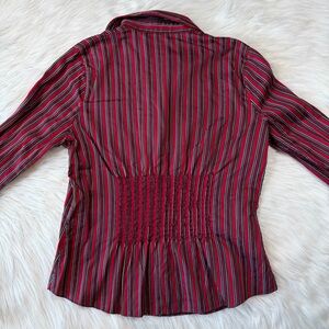 Eye Y2K Button Down Top. Classic vintage long-sleeve button-down shirt in rich burgundy, red with black & white vertical stripes. Features a pointed collar, front button closure, & a flattering lightly tailored waist with pleats for shape on front & back. Finished with wide cuffs & adjustable button detailing for a polished look. Versatile piece that works great for the office or styled casually with denim.