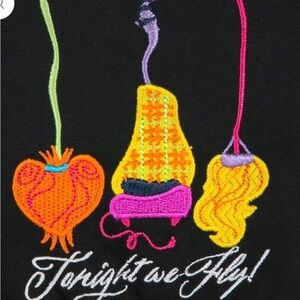 ''Tonight we fly'' embroidered beneath broom, vacuum and mop appliqués on back