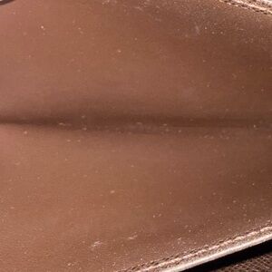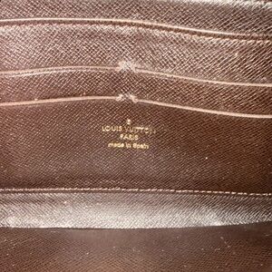Lv wallet with iconic monogram pattern. Features a deep brown hue.