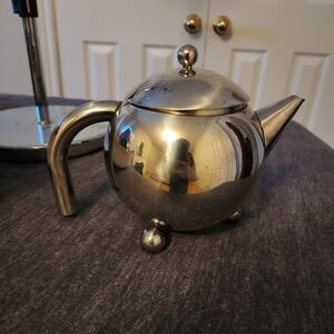 This small stainless steel teapot has cute little round feet and a great handle, perfect for brewing your favorite teas. Its sleek silver design adds a modern touch to any kitchen.