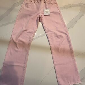 Brand New!! Meet your new favorite jeans. Designed with a flattering mid-rise and a unique bowed leg silhouette, these jeans offer a modern twist on a classic style. The straight leg is subtly bowed at the knees, creating a gently arched shape that's both comfortable and chic. In our soft Blush pink denim, these jeans add a touch of feminine color to your wardrobe. The cropped ankle length and clean hem make them perfect for showcasing your favorite shoes.